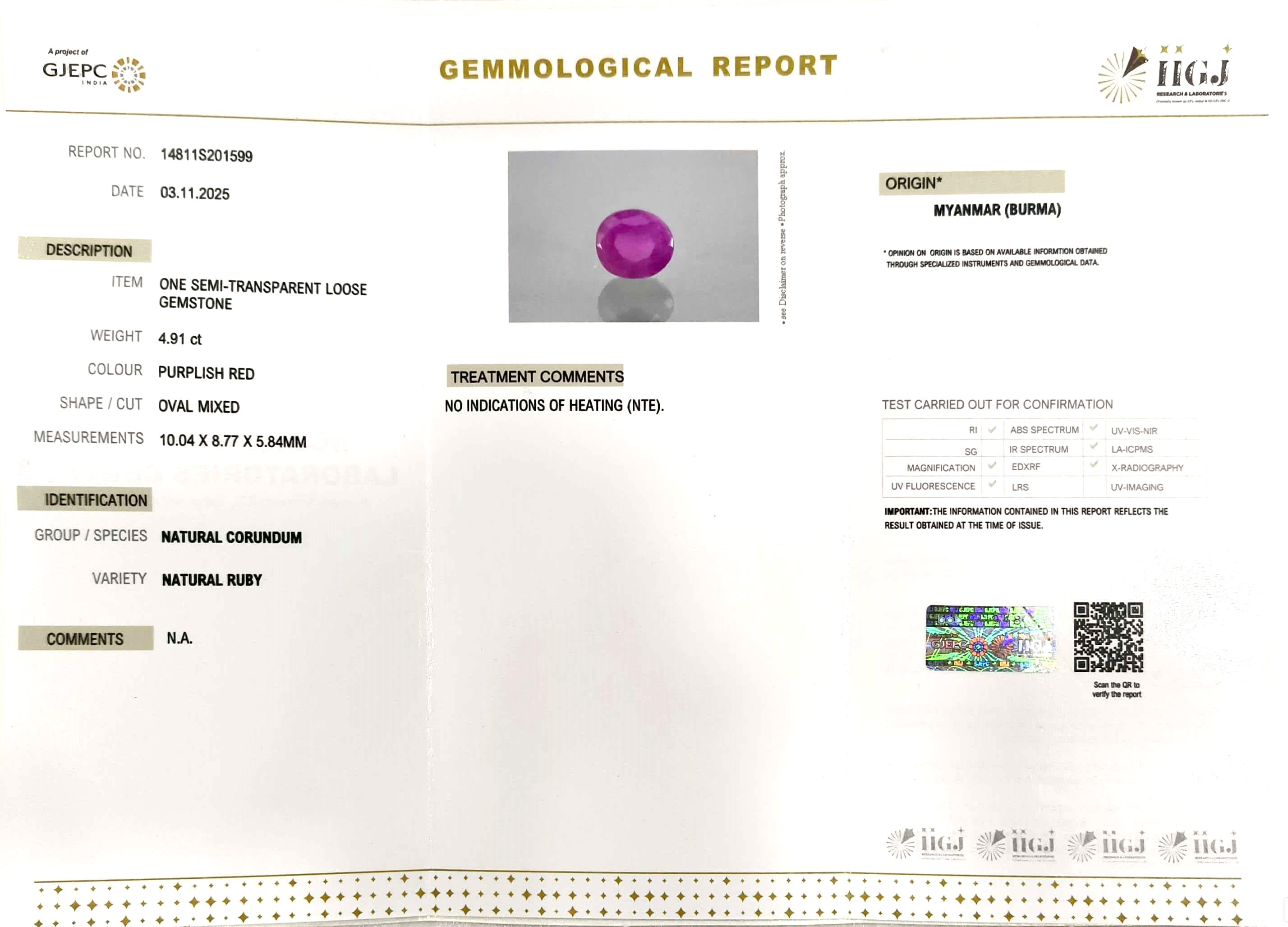 4.91/CT Natural Old Burma Ruby with IIG Govt. Lab Certificate (75000)