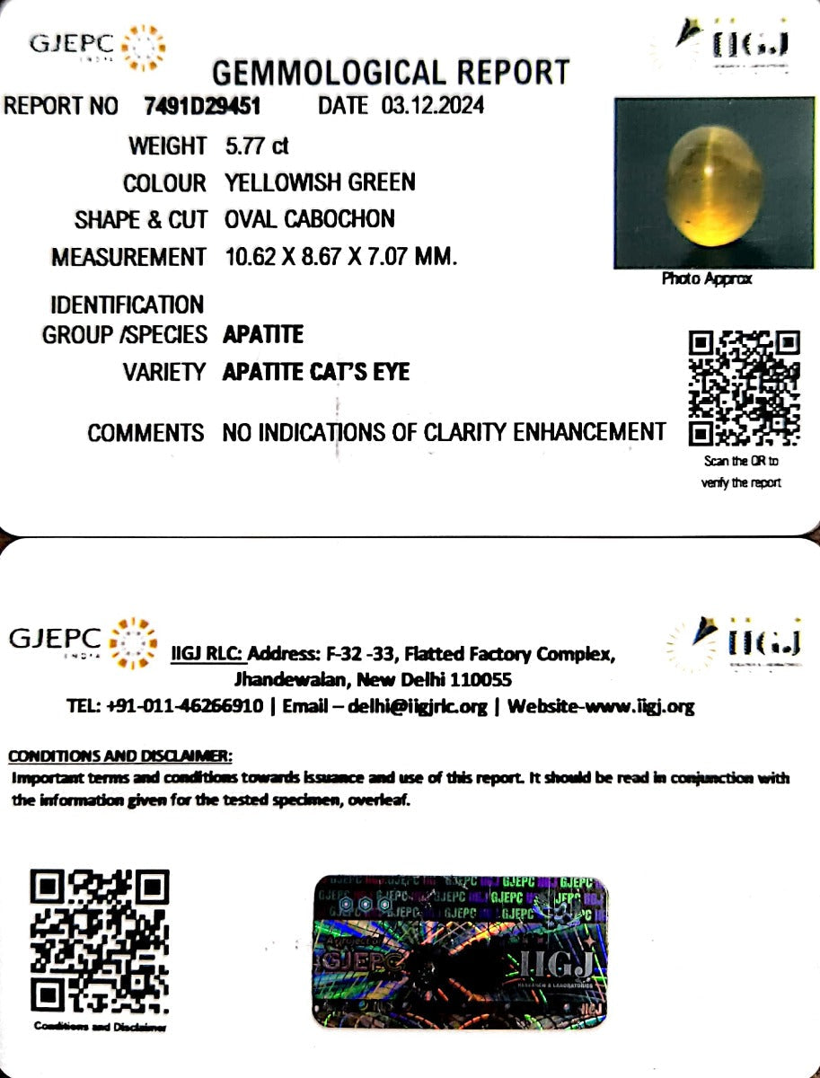 5.76/CT Natural Apatite Cat's Eye with Govt. Lab certificate-1221