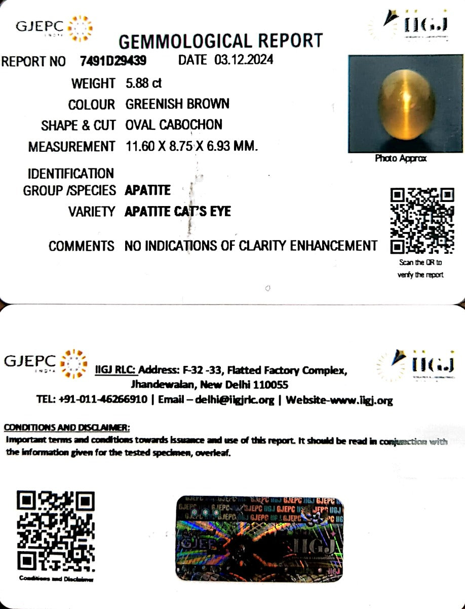 5.87/CT Natural Apatite Cat's Eye with Govt. Lab certificate-1221