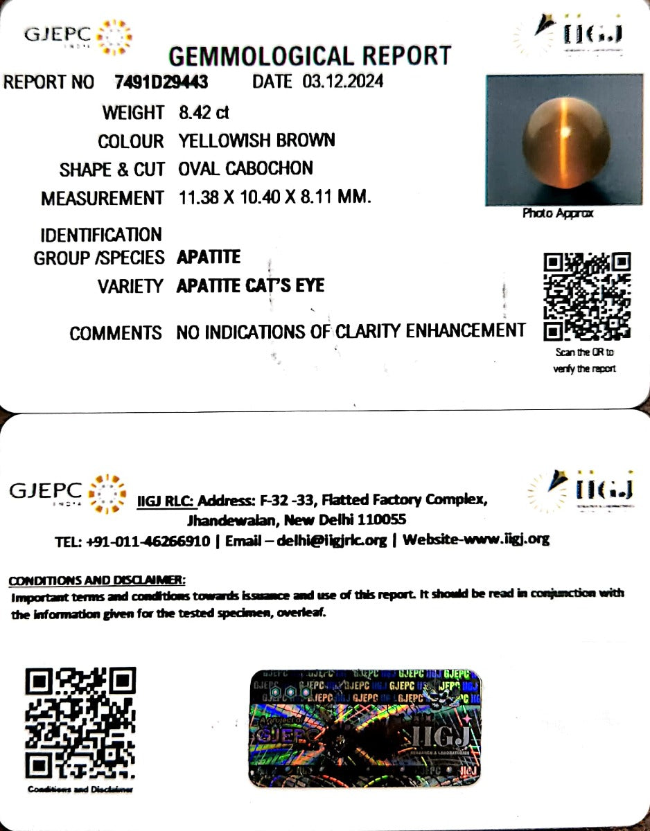 8.42/CT Natural Apatite Cat's Eye with Govt. Lab certificate-1221