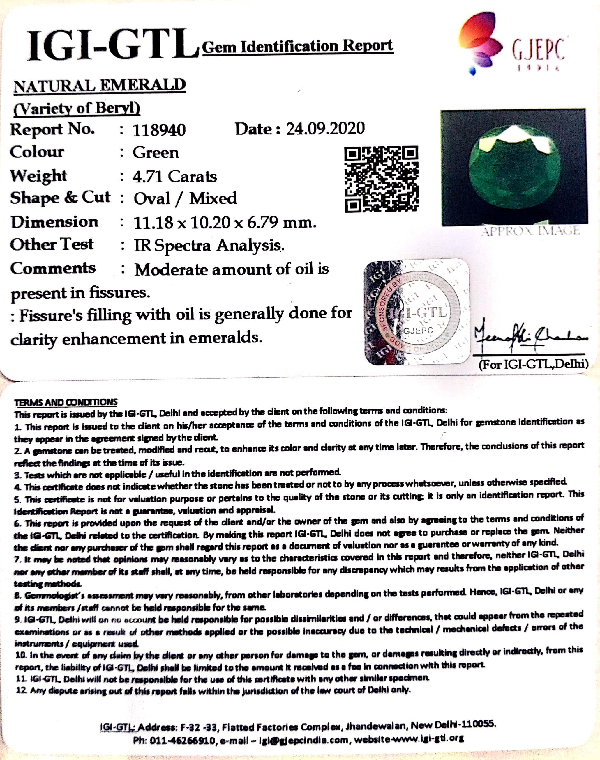4.71/CT Natural Emerald Stone With Govt. Lab Certificate (16650)