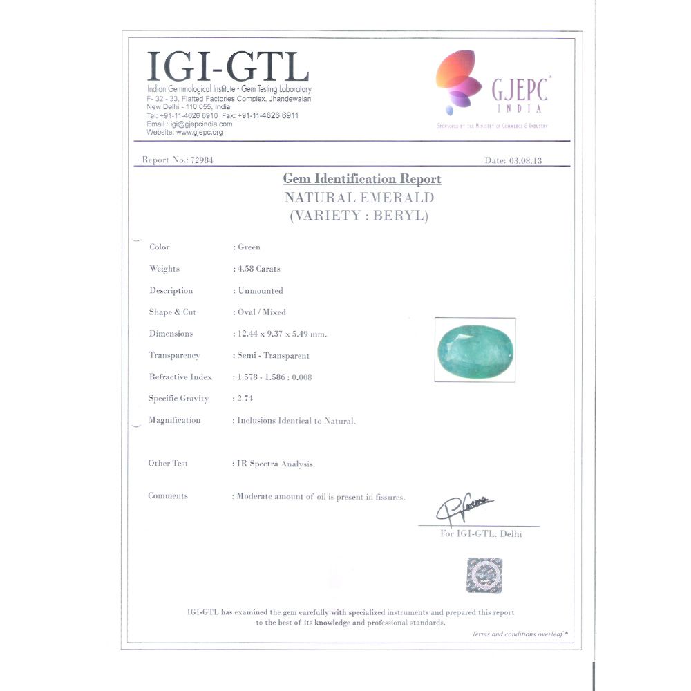 4.58/CT Natural Panna Stone with Govt. Lab Certificate (16650)