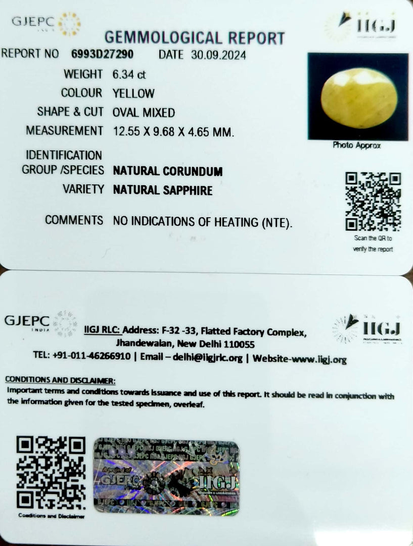 6.34/CT Natural Yellow Sapphire With Govt Lab Certificate