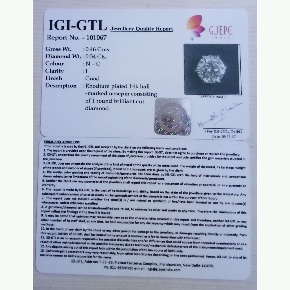 Raodium plated nose pin consisting of 1 round brilliant cut diamond