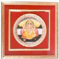 A work of artisans of Rajasthan this Marble plate of 9 inch diameter with hand painted image of Lord Genesha. Colors used are rich and permanent and includes an extensive use of 22 k gold in colors. (Framed in exclusive Italian frame is ready to be hanged from walls or placed on a pedestal)